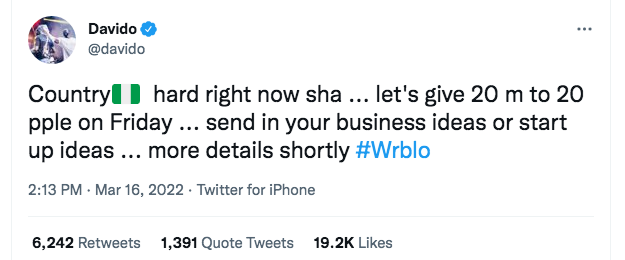 “Country hard right now sha … let’s give 20m to 20 people on Friday … send in your business ideas or start-up ideas … more details shortly #Wrbl,” Davido wrote on Twitter.