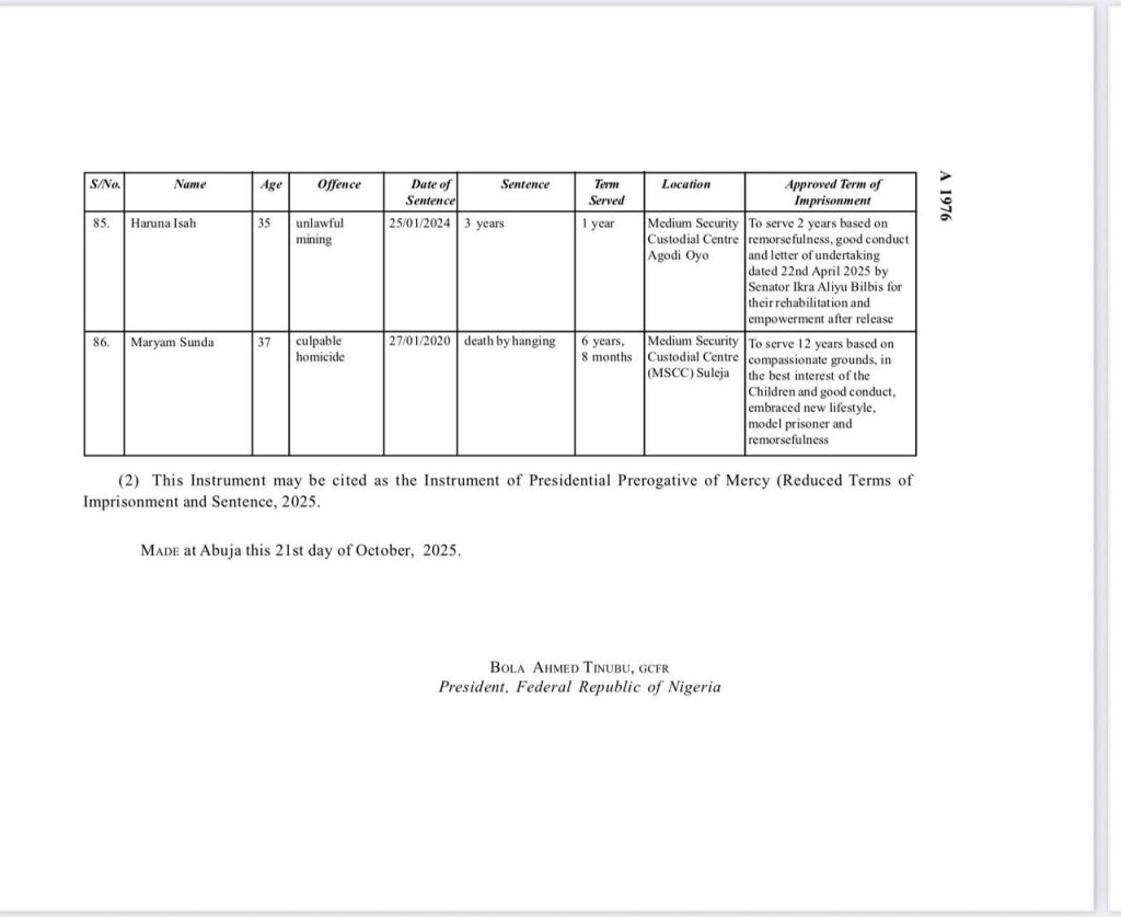 The document, titled Instrument of Presidential Prerogative of Mercy (Commutation of Death Sentence to Life Imprisonment), 2025, was signed in Abuja on October 21, 2025.